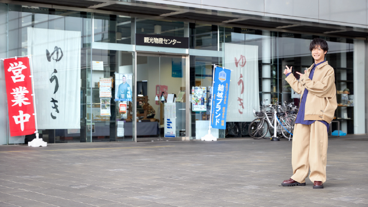 最初に訪れたのはJR結城駅前にある「結城市観光物産センター」。大塚さんは、入り口横に貼ってあった本スタンプラリーのポスターを見てにこり。そして「茨城は小学生の頃、少年サッカーの合宿で鹿島を訪れたきり。今回、茨城を堪能したいと思います」と意気込みを語る大塚さん。