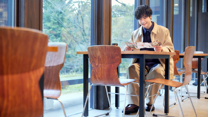 カフェスペースで窓から木々を眺めつつ、コーヒーを飲みながら今まで押したスタンプを見返す大塚さん。「こちらは筑波山周辺の観光案内の情報も充実していて、散策の拠点にピッタリですね。森の地形や樹木を生かしたフォレストアドベンチャーも隣接していて、私も次回はチャレンジしてみたいです!」と早くも次なる旅のプランが飛び出しました。
