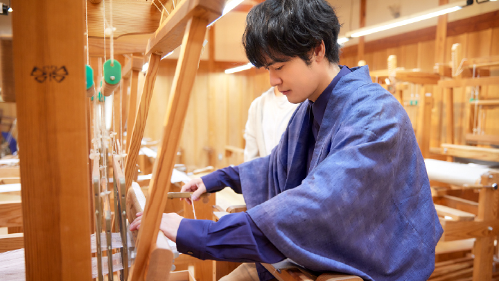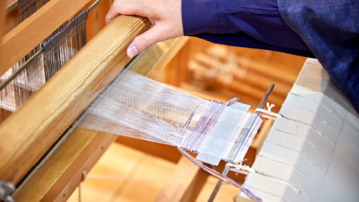 大塚さんは次に結城紬の機織り体験ができる「つむぎの館」を訪れ、コースター作り体験に挑戦しました。糸は数種類から選ぶことができるため、こちらでも壬氏をイメージした紺系のものを選んだ大塚さん。縦糸が張られた機織り機に横糸を通して打ち込みます。大塚さんは足と手を同時に使う作業工程に最初は戸惑っていたものの、すぐに慣れ、リズムよく生地を織っていきます。30分程度で約10cm四方のコースターを織り上げました。