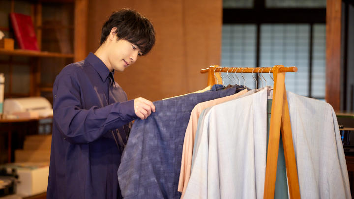 「今回は壬氏のイメージに合わせて濃紺の羽織を選びましたが、華やかな色のものも多く、袖を通してみたいと思いました。その日の気分でいろいろ選べるのもいいですね」と大塚さん。