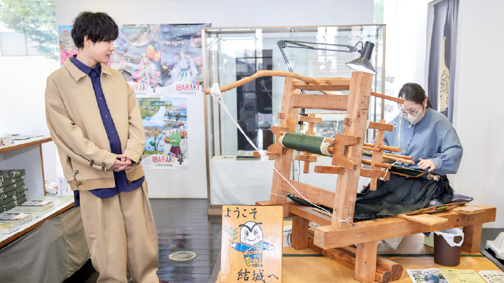 その後、結城紬の小物や下駄などの桐製品のほか、うどんやみそ、お菓子など結城市が誇る物産を眺められました。また、館内には結城紬の機織り機も設置されていて、実際に結城紬の機織り実演も行われていました。大塚さんは、機織りの実演をじっと食い入るように見つめ、途中、織り方について質問する場面もありました。