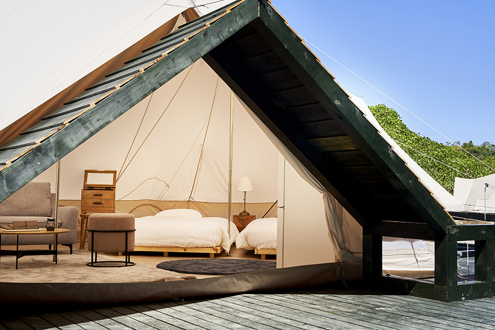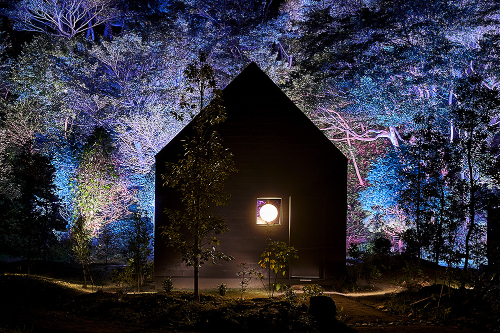 また、隣接する「五浦 幽谷隠田跡温泉」は、そんな自然とチームラボ作品が融合する環境に包まれながら、コテージやグランピングで宿泊できる施設です。源泉かけ流しの温泉や地元の食材を使った食事も堪能することができます。